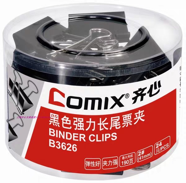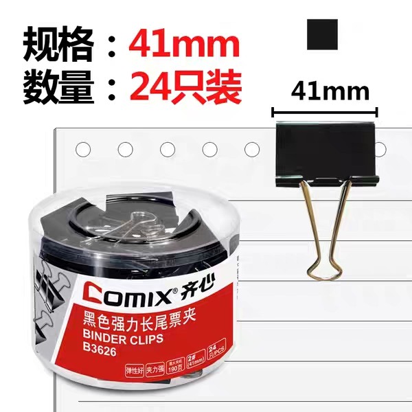 办公文具->*针钉夹->长尾夹>>>   齐心黑色长尾夹B3626 41MM/36合/件/407号