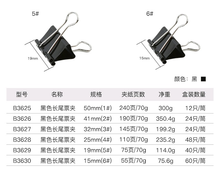 商品名称 齐心黑色长尾夹B3627/32MM /48合/件/408号