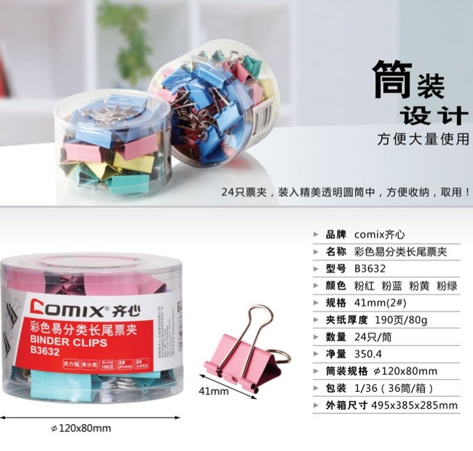 办公文具->*针钉夹->长尾夹>>>   齐心彩色长尾夹B3632/41MM/36筒*24个/筒/件/413号
