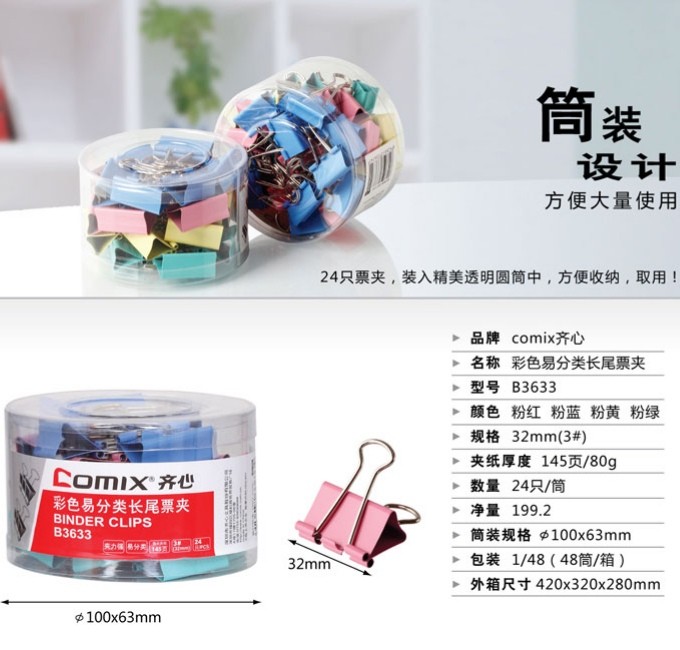 商品名称 齐心彩色长尾夹B3633/32MM/48筒*24个/筒/414号
