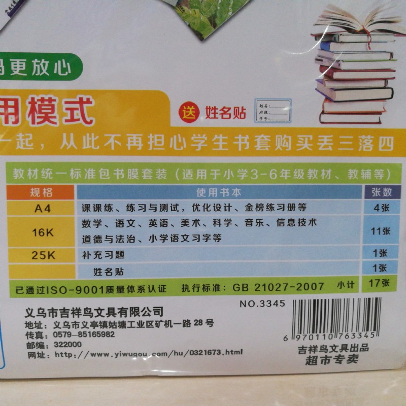 学生用品->笔盒/笔袋/书夹/书套/书立->书套>>>   吉祥鸟环保套装书套/17张/包