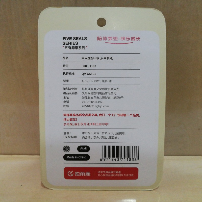 学生用品->笔盒/笔袋/书夹/书套/书立->笔盒>>>   独角鹿4个装五有印章/水果系列/18排/盒